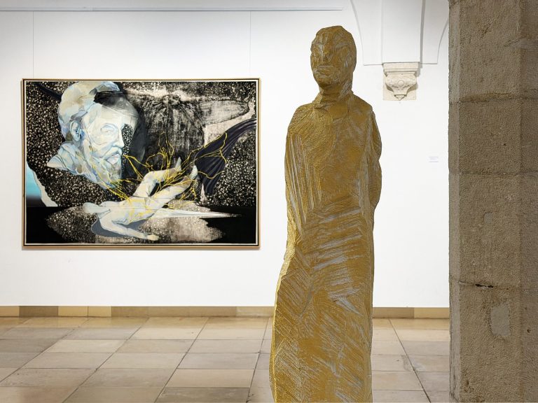 Dem Maler-Bildhauer Christofer Kochs widmet die Stadt Neuburg a.d. Donau eine umfangreiche Schau. Im Rathausfletz treffen wir auf ausdrucksstarke Gemälde, Zeichnungen und Skulpturen des in Augsburg lebenden Künstlers. Besonders eindrucksvoll: das großformatige Gemälde „Flügelschlag der Endlichkeit“ (Abbildung) in Tusche, Stoff und Öl auf Leinwand aus dem Jahr 2026. > KLICK